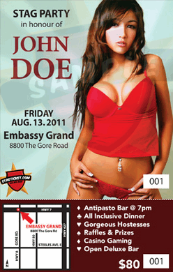 Ordering Tip 1 :  Before you buy your bachelor party invitation cards, we suggest you create a tentative guest list of people you intend to invite.  This will give you a general indication of the amount of people attending and allow you to order the right amount of invitations for your party.  We suggest you purchase at least 50 additional tickets than your rough guest count as you will find that some of your guests will either lose there ticket or forget to bring it the day of your party!   Don`t risk the embarrassment of not having enough invites for your guests for a nominal cost difference.